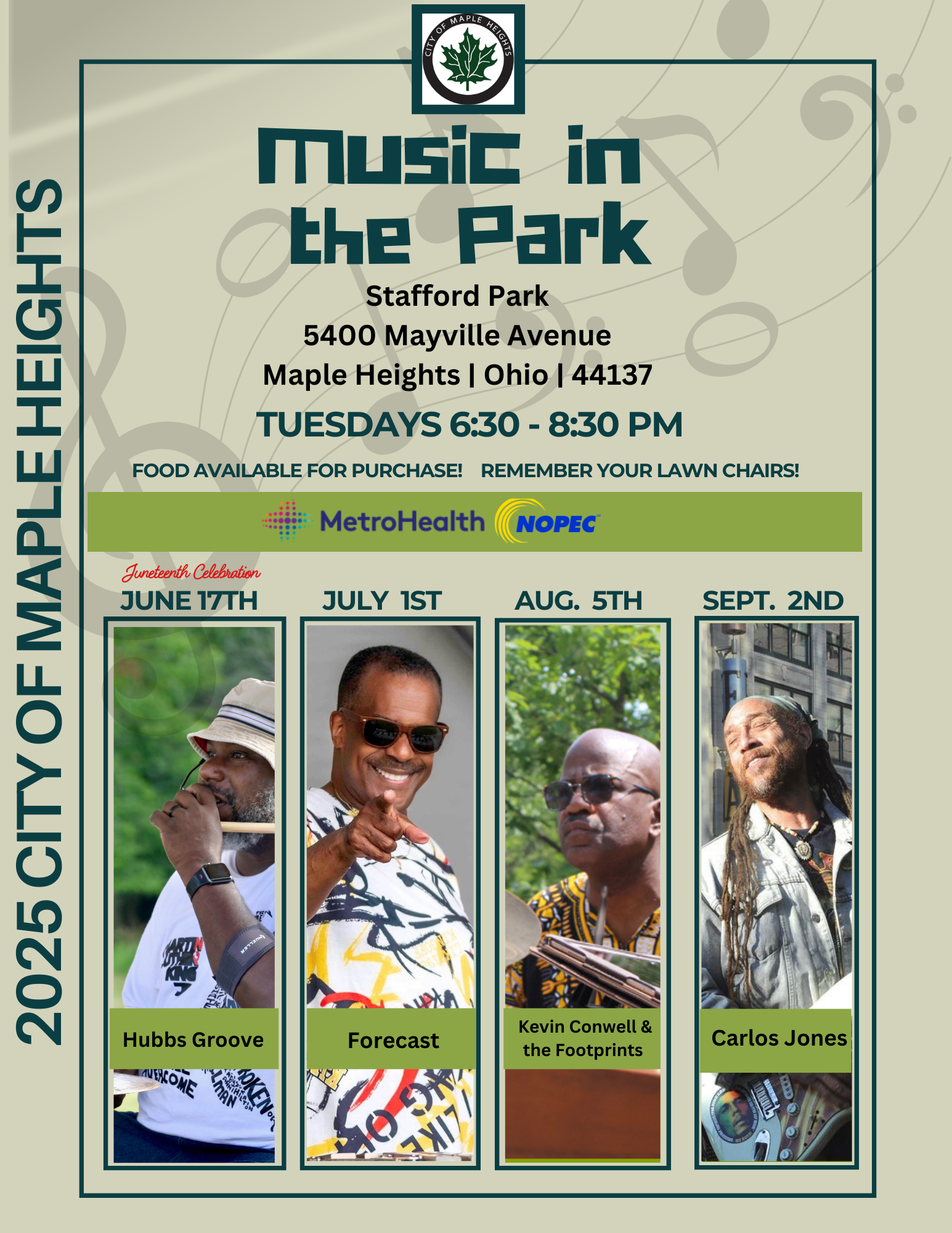 Introducing the City of Maple Heights Music In The Park 2025 Series! Four amazing shows for you this summer; including a special homecoming for Carlos Jones, who wraps this season up with the last concert on Tuesday, September 2nd! We begin this Music In The Park season with our Juneteenth Celebration and crowd favorite Hubbs Groove; followed by the fantastic sounds of Forecast in July. Our August show features Kevin Conwell & The Footprints, leading to the series finale in September. Mark your calendars, this 2025 Series is going to be amazing from start to finish!