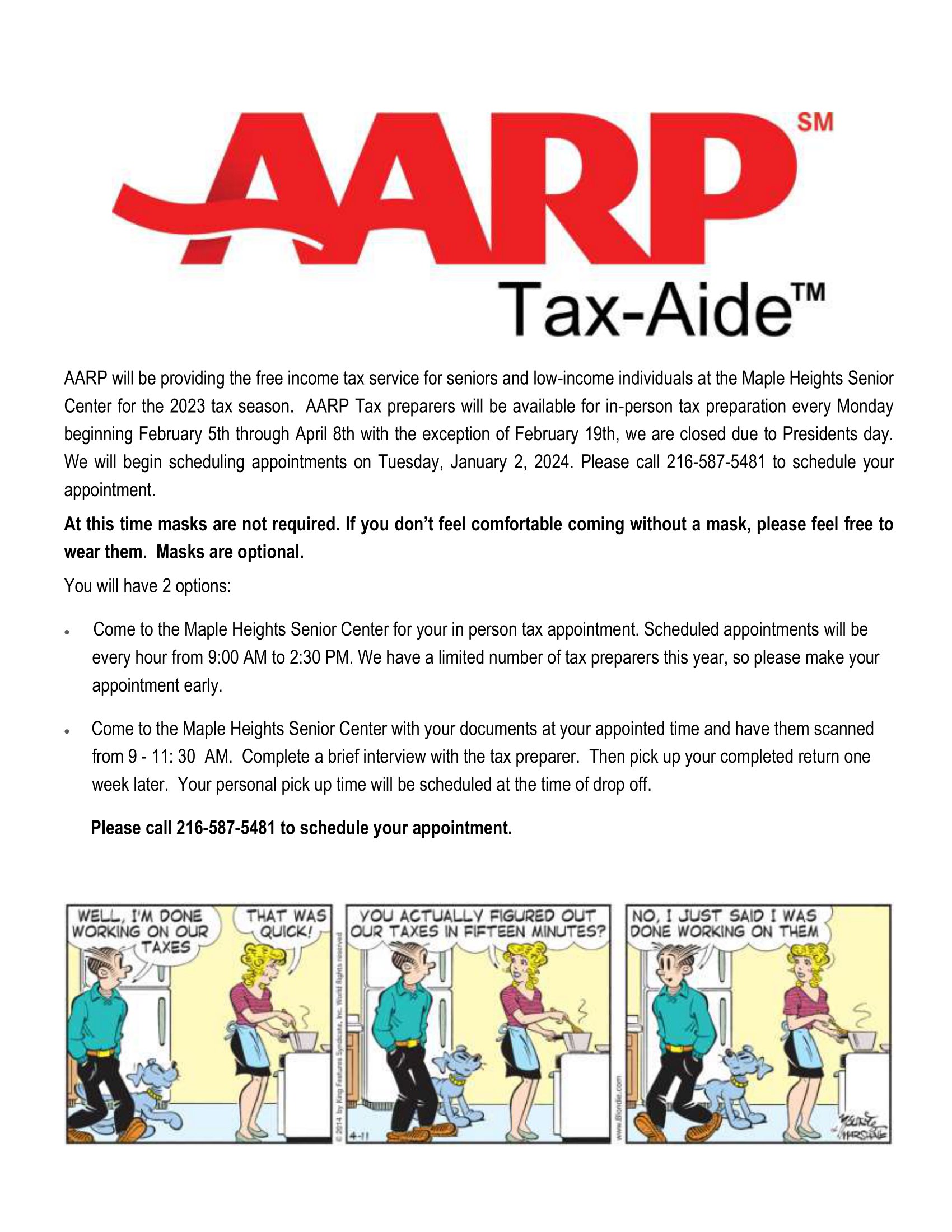 The AARP will once again be providing free tax preparation services for the 2023 tax season, for Maple Heights seniors and low-income Maple Heights residents at the Maple Heights Senior Center. The appointments will be held every Monday beginning February 5 through April 8 (except for February 19, President’s Day). Appointments must be scheduled with the Senior Center, by calling 216-587-5481 beginning on January 2, 2024.