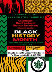 Make plans to celebrate Black History Month by visiting the Community Life & Education Committee’s display; located at the Maple Heights branch of the Cuyahoga County Library, Saturday, February 18, 2PM-4PM.