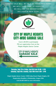The Annual Maple Heights City-Wide Garage Sale is being held Thursday 9/7 and Friday 9/8 from 10AM-5PM; and Saturday 9/9 and Sunday 9/10 from 10AM-5PM. Residents who are interested in participating may fill out a registration at the Senior Center, through 8/30. Cost is $5 which includes a city permit and a new sign.