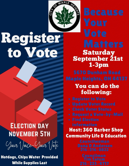 Make plans to attend the Community Life & Education Voter Registration Event; Saturday, 9/21; 1:00-3:00PM; 360 Barber Shop, 5670 Dunham Road. Register to vote, check your voter registration, request a vote-by-mail ballot, and more. Food provided, while supplies last. Details, below.