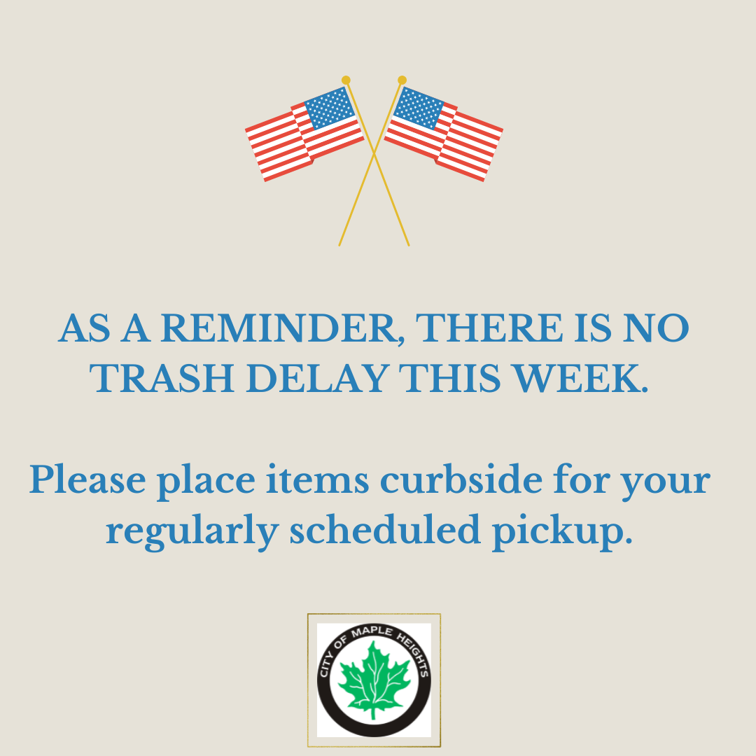 As a reminder, there is NO TRASH DELAY this week.  Please place items curbside for your regularly scheduled pickup.  Thank you!