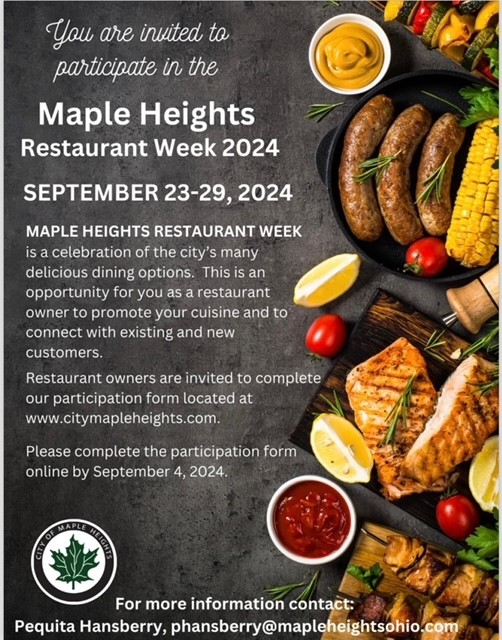 Mayor Annette M. Blackwell invites all Maple Heights restaurant owners to participate in this year’s inaugural Maple Heights Restaurant Week, 9/23-9/29! Maple Heights is home to numerous delicious dining options, promoting and celebrating local food, and we are excited to showcase all of our amazing cuisine offerings with our very first Restaurant Week! Restaurant Week will encourage the community to not only support their favorite establishment, but also venture out and try something new! If you would like to participate in this year’s Restaurant Week, we invite restaurant owners to complete the participation form located on the city’s website here: https://mapleheightsohio.gov/government/departments/planning-development/maple-heights-restaurant-week-2024/