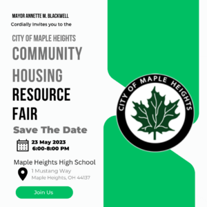 Mayor Annette M. Blackwell cordially invites you to attend the City of Maple Heights Community Housing Resource Fair; Tuesday, May 23, 2023; 6-8:00PM; Maple Heights High School.