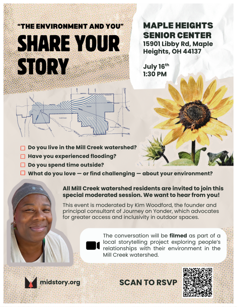 At the Maple Heights Senior Center, come share your experience living in the Mill Creek watershed! Let us know if you’ve experienced flooding, how you enjoy spending time outside, and what you love about the environment around you.